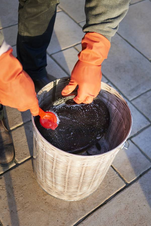 Take a bucket, 5 liters of water, and gloves. Pour 10 cl of 100% soluble natural liquid into the bucket filled with water.