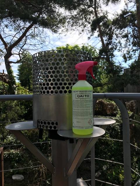Use a flat metal spatula or scraper to remove stuck food. For grease and soot, apply a non-caustic degreaser such as Décap’Graiss QAÏTO or a mixture of warm water and vinegar. Avoid steel wool or abrasive cleaners, as they can damage the surface.